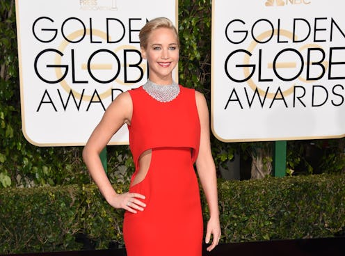 J. Law has always been a standout on the red carpet, and the looks have only gotten better and better since she became the face of classically chic house Dior. Since being named the spokesperson, Law has been seen sporting their looks at almost all of her red carpet appearance including wearing some seriously stunning ensembles at the Mockingjay premieres across the world. While premieres have been graced with J. Law's presence in Dior, her most notable moments have been on the red carpet during award season. In fact, Jennifer Lawrence's 2016 Golden Globes dress is just one in a long string of killer frocks — just take her 2014 Oscars gown. That Dior designed crimson piece was a total fashion moment, and tonight's red, cut-out gown was definitely a fashion forward redo of that gorgeous gown.