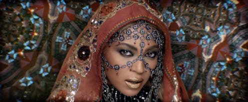Sure, she's forgone the bindi, which has cropped up recently as a trend that's actually just cultural appropriation in disguise, but otherwise she's fully costumed at various points throughout the video in everything from a head covering, elaborately embroidered and beaded garments, bangles, a crown of flowers, henna, a full decorative neck and face piece, and thick kohl liner. And "costumed" is absolutely the word I want to use there, because that's what it feels like. In the video, Beyoncé isn't wearing just wearing clothes; she has slipped into a character, which involves draping herself in the aesthetic elements of a culture to which she doesn't belong. Worse, her character appears on screens and in ethereal visions, propagating a kind of "otherness" that Martin's awed exploration of the country in his sections of the video does not. Bustle contacted Beyoncé's representatives for comment, but did not receive a response at the time of publication.