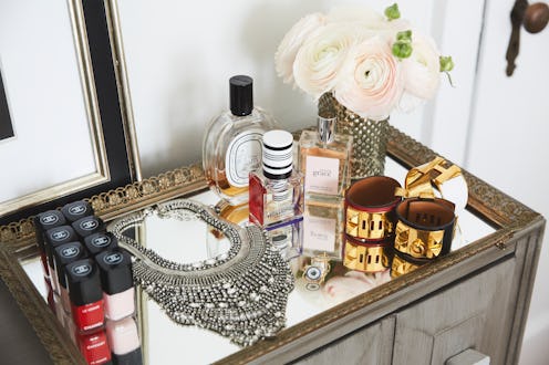 This small antique mirror can easily be repurposed as a vanity tray — a simple way to add a timeless feminine touch to any bedroom.