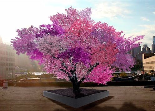 Artist Sam Van Aken envisioned a tree that could grow a variety of different stone fruits (cherries, peaches, apricots, etc.), thus doing away with the necessity of growing a different tree for every type. As a sculptor, Aken wanted to design a tree that would be gorgeous, but also practical. He created a plan for a tree that would reasonably be able to grow 40 types of fruit, but also look stunning when it bloomed. Over the past few years, he's made his vision into a reality by grafting fruit-bearing trees together in a process called chip-grafting, which involves making a cut in the base tree, or "working tree," and inserting a budding branch from another kind of tree. It takes about five years for the process to come to fruition (OK, sorry, I had to make that pun and you can slap me now). If you want more details about how exactly he crafts a tree, you can watch his TEDxManhattan talk below: