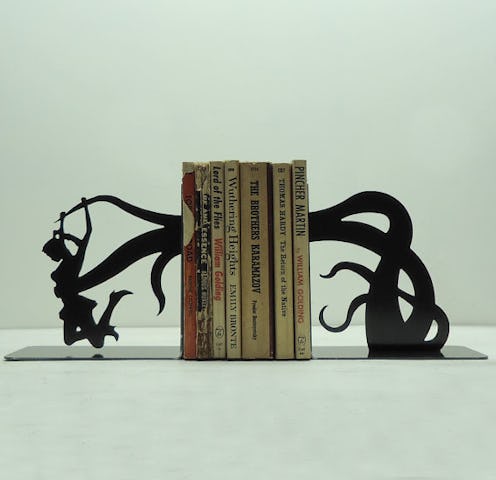 There are many, many, many , funky bookends available out there. (And then there’s this one, because iPads are otherwise totally useless, amiright? Pro-tip: You can also use your spare hundred-dollar bills as bookmarks!) But my personal favorite are the Portal bookends. Though we can only metaphorically be transported into the worlds of books, this little guy zips through your bookshelf quite literally. Or maybe he’s actually just looking for some cake.