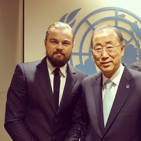 DiCaprio visited the U.N. on Tuesday to give a speech on the climate crisis and decided it was the perfect time to join Instagram. As evidence of the professional-type of Instagram he's sure to uphold, DiCaprio's first two debut pictures are of the U.N. General Assembly floor and a photo with U.N. Secretary-General, Ban Ki-moon. What should also be noted is the third person in the picture, DiCaprio's lush beard, that he should certainly enter in to some sort of contest. Body hair aside, I think you see what I'm getting at here... we're almost guaranteed to never see DiCaprio share a picture of his particularly foamy looking cappuccino. But, even more importantly, he does give you so many opportunities to get behind various charities and movements close to his heart. If you follow DiCaprio on Twitter, you'd know that he pretty much only tweets about his charity and activism, and it's likely his Instragram account will be a continuation of that, just on a different platform.