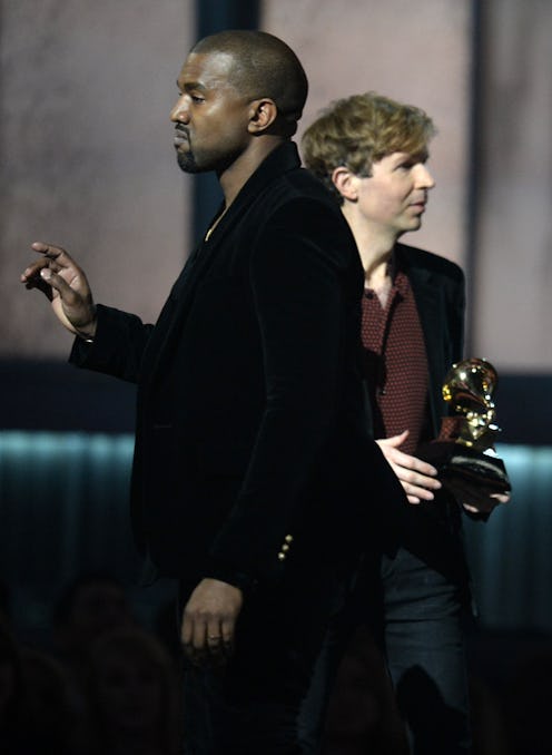 The 2015 Grammy Awards have been a real roller coaster of emotions. From excitement to disappointment, laughter to utter boredom, Sunday night's ceremony has been all over the place, but there's one sequence of events that truly stands out for going from one extreme to the other. First, an extreme low point: Beyoncé lost the Album Of the Year Grammy to Beck, which was completely shocking. But just when I thought I had fallen into a pit of emotional despair I could never crawl out of, Kanye West appeared on the Grammys stage, apparently to recreate his infamous moment from the 2009 VMAs when he interrupted Taylor Swift's acceptance speech and took the microphone to proclaim that Beyoncé should have won.
