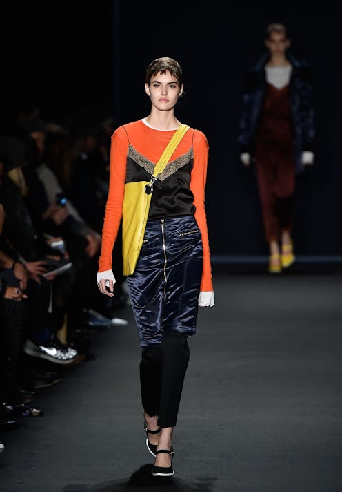 The Fall '15 show featured models donning silk, lace-trimmed camis on top of long-sleeved crewneck tees in an array of bright colors. If that doesn't scream 2002 I don't know what does. The masterminds at R&G didn't stop there, they threw in a whole slew of '00s inspired accessories such as fanny packs, zippers, satchels, and shiny fabric galore — oh my! So if you've stored away your old lace-trimmed satin tanks in hopes of one day breaking them out again, you're in luck.