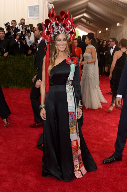 I have always wanted to be a hat woman. One of those people who could confidently don some ridiculous fedora, Panama, or, hell, even a pillbox hat and not be self-conscious about the fact that everyone is looking at my head, judging whether I'm pulling it off or not. (It would be the first time anyone would ever say, "Eyes are down here, buddy!") Which is why I can't have anything but mad respect for Sarah Jessica Parker's hat fashion over the years. And the Sex and the City star only solidified her reputation as a no-fear hat-wearer Monday — after all, Parker's Met Gala Philip Treacy headdress is quite a vision.
