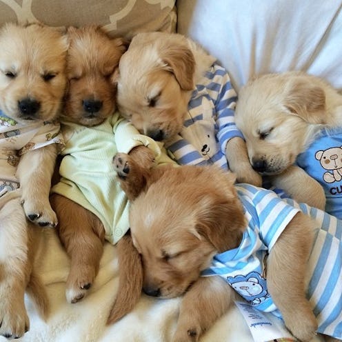 The account only launched last month, but it’s already amassed an all-too-adorable collection of puppy photos — from the golden retriever puppy in a striped onesie to the little chocolate lab in pink and white, star-patterned pjs, to the French bulldog in a black-and-red striped get-up with buttons near his tail. Probably my top favorite of all the snapshots? A heart-breakingly cute pic of two cuddly pitbull pups, lying on a blanket in matching fleece-y pajamas. I dare you to look at that photo and not immediately crack a smile.