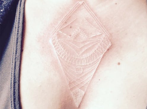 Genetics play a role in how white tattoos look after a tan, but even those who have a high tolerance for the sun seem to be struggling with their white tattoos accidentally being exposed. A friend of mine took a long walk after her white tattoo (pictured above) had healed, and only a week later, she was left with tiny bumps and little sign of the beautiful tattoo (see below). Now, her biggest concern isn't even how to keep her tattoo longer; it's how to get rid of those crazy bumps it and the sun left behind. Fortunately, having an elegant white tattoo for a week was worth the cash for her, and she's not kicking herself over it going wrong.