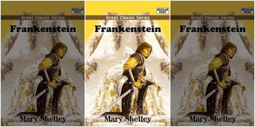 Ah yes, Frankenstein. The famous of tale of a young gender-ambiguous knight, and their quest to... scale Mount Everest? Look, I'm not saying that every copy of Frankenstein needs the same flat-top monster with neck-bolts on the cover... but in what way does the image of a concerned knight represent the story of Dr. Frankenstein and his monster made of re-animated corpses?