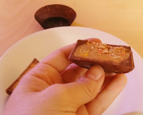 Here, you can see a little bit more of the pieces working their magic. The Reese's Cup stuffed with Pieces was crunchier and sweeter than a normal Reese's Cup — both a product of the addition of candy shells. The effect of adding Pieces was less the sheer novelty of the thing, and more a move toward the taste and texture of a homemade Buckeye, which is perfectly OK with me. This thing was delicious.