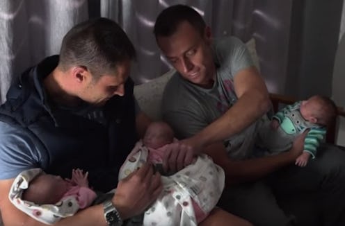 In adorable baby news: a surrogate for a same-sex couple in South Africa has delivered triplets born with both their father's DNA. First-time dads Theo and Christo Menelaou are both biological fathers to the set of triplets — which is believed to mark the first such instance in medical history. Each fertilized an individual egg, however one of the embryos split in two after being implanted, creating identical twins. Though many doctors recommended terminating two of the three pregnancies, giving one child a higher chance of survival, the surrogate and the fathers chose to push forward and carry all three to term.