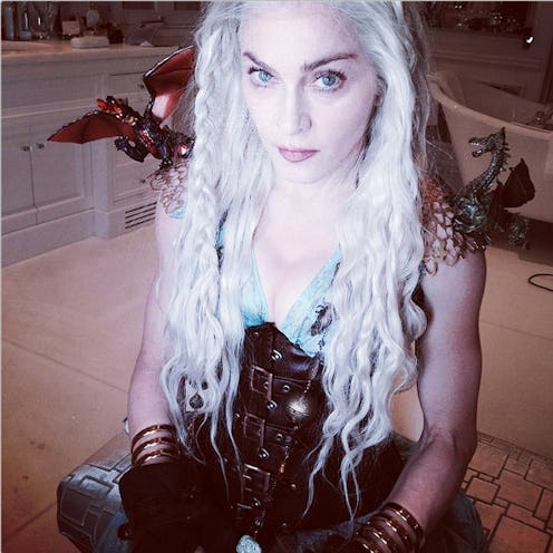 Purim is upon us, and no matter how you chose to celebrate — maybe you dressed up, maybe you had some hamantaschen, maybe you were too busy enjoying St. Patrick's Day Weekend (green beer!) — odds are, you got outdone by Madonna. In honor of the revelrous Jewish holiday, the singer and longtime Kabbalist convert took to Instagram to post a selfie of her Daenerys Targaryen costume. That's right: Madonna dressed up as Khaleesi from Game of Thrones for Purim and the results are kind of incredible. From the sculpted dragon epaulets to the buckled leather bodice — even the wavy white-blonde coif, as worn by actress Emilia Clarke on the show — this costume is definitely on point. Still, you've got to wonder: ...Why? Sure, Madge has been a bit inscrutable as of late across the board, but this latest dress-up development, if fabulous, adds yet another question mark.