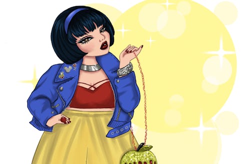 "I believe glam has nothing to do with size and everyone has the right to it," Norwood tells Bustle. "I dressed [the princesses] in clothing from and inspired by great brands that cater to the plus community. Like Snow White, who is sporting a Lane Bryant bomber jacket and Society+ inspired cage top. Or Ariel’s dress that was directly inspired by a Courtney Noelle dress."
