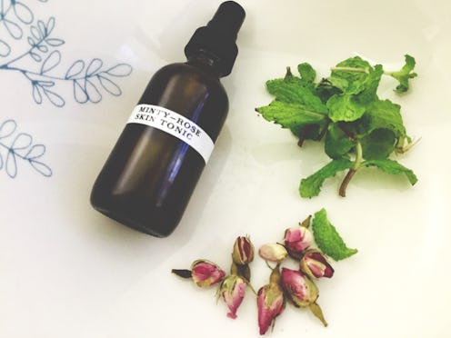 I love making skin tonics to control oil production and lighten any pesky scars that creep up on me after even a mild break-out. Make a mint tea with hot water and add dried roses to balance the stimulating properties of the mint. The combination will keep acne away while giving you the nourishing, anti-aging properties that have made roses famous. Once the tonic has cooled, transfer to a tinted, sealable bottle and keep refrigerated for daily use throughout the week. Your tonic will turn within a day if left at room temperature, but will keep for up to a week in the fridge.