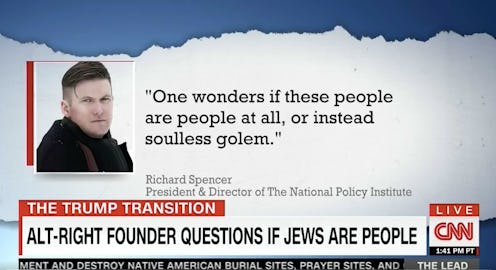 CNN set off a firestorm Monday when it aired a panel discussion with a chyron that said "Alt-Right Founder Questions If Jews Are People." A few screenshots of the segment quickly circulated on Twitter, and many sensible people were outraged, in large part because CNN had chosen to identify the man in question, Richard Spencer, as an "alt-right founder" rather than a neo-Nazi. But while Spencer is certainly a neo-Nazi, the truth behind CNN's "Are Jews people?" chyron is a bit more complicated.