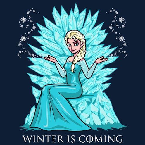 I mean... winter IS coming to the Realm of Westeros and who better to rule that Iron Throne than someone who's never really bothered by the cold at all? That's right, the Frozen and Game of Thrones mash-up you never knew you wanted or needed is here, in t-shirt form, thanks to the folks at Neatorama. Which means you can buy it! You can literally wear this on your person (if you're so inclined for such fandom mash-ups), and it's visual proof that Elsa would be a totally great ruler of the world George R.R. Martin created in his A Song of Ice and Fire series. And we've got the examples to prove it.