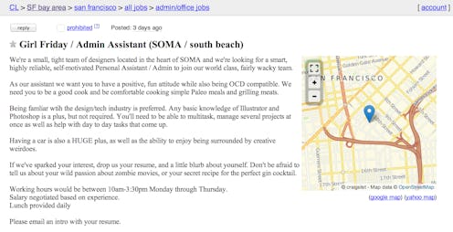 You know, some Craigslist ads are just better left unposted. Such is the case with this "Girl Friday" Craigslist ad from a Bay Area start-up hoping to hire that special someone to clean dishes, grill meats, and hopefully use Photoshop on the side. Valleywag found the post — which, amazingly, is still online — for a "business" apparently looking to hire someone willing to simultaneously fulfill the roles of mom, chauffeur, chef, Manic Pixie Dream Girl, cleaning lady, receptionist, accounts receivable, office coordinator, social media specialist, tech support — no I am not kidding — recycling czar, project manager, and personal shopper.