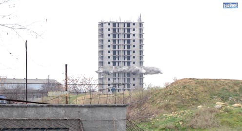 If you've ever wanted to see what a failed building demolition looks like, it's your lucky day here on the Internet. Somewhere in Russia or its neighboring countries (not a ton of info is available about this video, so pardon the conjecture), what looks like a bleak, grey apartment building was scheduled to be destroyed. Crowds gathered with their cameras (because it's always fun to watch stuff blow up, right?), ready for the epic explosion of concrete. And an explosion did happen, but what happened next wasn't exactly what everyone expected: The building kind of sadly sagged over like it didn't have enough strength, or it couldn't be bothered to fully collapse. In the crowd, a man laughed and said in Russian, "It didn't even fall!" Another noted that this phenomena is "interesting." I guess I would go with "a little pathetic," but I guess I have high demolition standards.