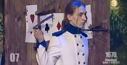 However badly your work day is going, take comfort: This knife thrower’s assistant has just had a worse one. Things took a hair-raising turn on Lithuania’s Got Talent recently, when a knife-thrower’s incompetence literally left blood on the stage. Cringe-inducing video of the show reveals an inept knife-thrower haphazardly launching knives toward a variety of objects, hitting none of them, and endangering the life of his assistant in the process. I dare you not to squirm as the knife thrower first cuts the fingers of his assistant’s left hand, only to then narrowly miss his right hand a few seconds later. At around the three minute mark, the beleaguered assistant flinches as another knife lands a mere centimeter or two from his head, and the end of the video shows the thrower trying to mop up blood with his shoe. Although I cannot translate the judges’ responses at the end of the video, I would imagine that this duo did not move forward in the competition. Also, can we take a moment and respect the strength of spirit of that assistant? I pretty much would've been calling "game over" as soon as my first hand was nicked.