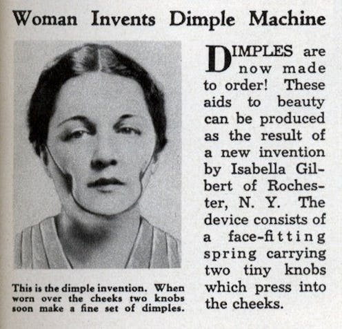 In 1936, tired of her no-good, perfectly smooth face, Isabella Gilbert of Rochester, New York made the kind of device you’d expect to see in a Saw movie, not sitting on the boudoir of a fashionable young lady. Apparently you were expected to fall asleep with this contraption on, and wake up to a beautifully dented face in the morning.