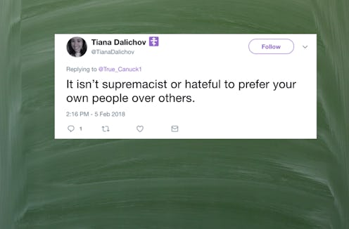 "It isn't supremacist or hateful to prefer your own people over others," wrote a Twitter user under the name of Tiana Dalichov. The Twitter account has since been deleted, but HuffPost reported that "Tiana Dalichov" is a pseudonym for Volitich, a 25-year-old social studies teacher at Crystal River Middle School in Florida.