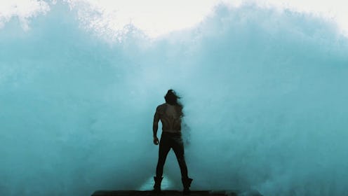 First, we see a glimpse of Jason Momoa as Aquaman, standing triumphantly while what seems to be a tsunami comes rushing toward him. Then we get another visual of Batman throwing Aquaman his magical trident. It looks like something action-packed is about to go down, but all I can wonder is — why are Batman's batty mitts are all over Aquaman's trident? Especially after the next clip, where we catch a glimpse of what the watery superhero can do with his tool, which appears to be manipulating the ocean to do his bidding while rocking the most intense high-concentration face I — nay, the world — has ever seen.