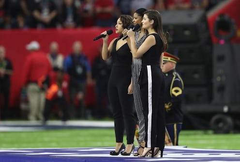 If you're still pining away for tickets to Hamilton (as so many of us are), then you were probably pretty excited to see the Schuyler Sisters at Super Bowl 51. Phillipa Soo, Renée Elise Goldsberry, and Jasmine Cephas Jones — the three original singers from the hit musical — sang "America the Beautiful." And it was, of course, amazing.