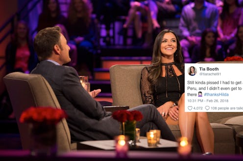 Bachelor Nation was shocked when Arie Luyendyk Jr. sent Tia Booth home right after hometown dates on The Bachelor, and she was clearly shocked when when she didn't get that rose. Aside from believing in her relationship with Arie, she was very prepared for the next trip the contestants would be taking. On Twitter Monday night, Tia tweeted about The Bachelor Fantasy Suite episode and said that she got shots in preparation for Peru trip, which is where the overnight dates took place..