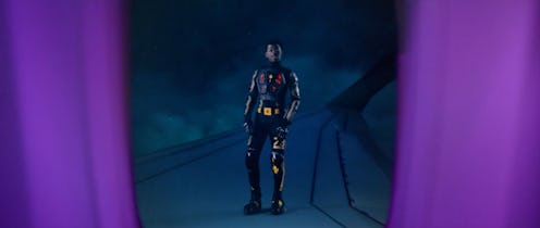 The video follows Jackson as she lives in a neon, Blade Runner-esque futuristic world, where Lil Nas X reigns supreme and seems to follow her everywhere she goes — and that means he's literally everywhere. He’s on every advertisement, for everything from water to Beats by Dr. Dre. His holograms singing lyrics from “Panini” follow her everywhere she goes, from main streets to alleyways. When she tries to get away in an Uber, he’s all over the car. And when she finally boards a flight to escape and get away from him, he lands on the wing of the plane, taunting her with his lyrics and eliciting the most hilarious (and relatable) reaction.