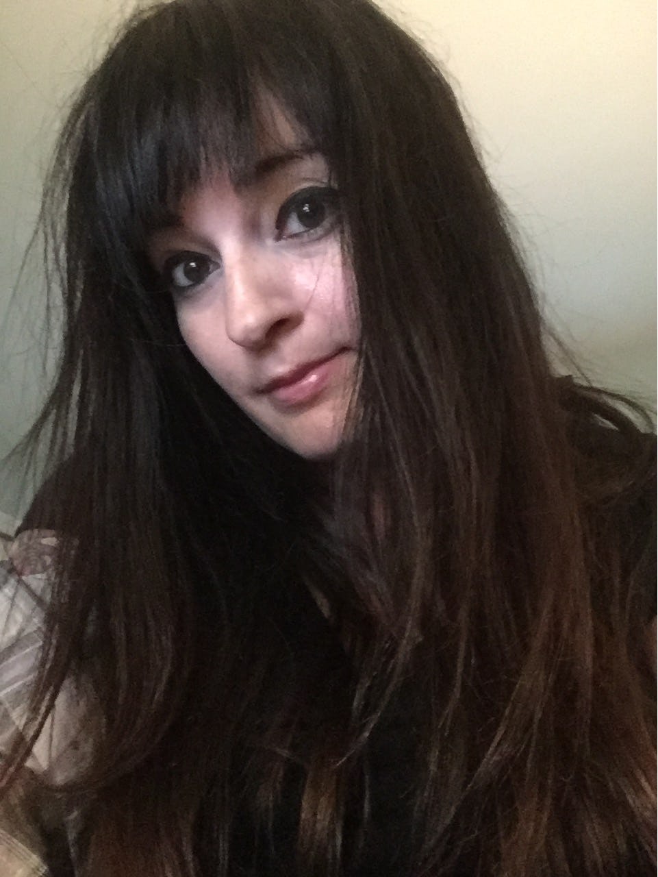 After I got dressed and worked for two hours, this is how my hair looked. Surprisingly, my bangs dried flat and evenly; I expected them to be unruly. My long layers looked pretty boho yet defined, which I liked.