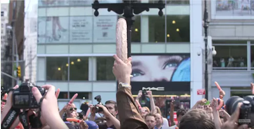 Dildo Wars quickly gained popularity on social media, with an RSVP list of over 2,000 people after only one week. Unfortunately, once the guest list swelled to over 5,000, Xander received a letter from the New York Department of Parks and Recreation saying that he might face criminal charges because the event is a "public danger." After initially canceling the event, Xander decided to continue with his brave and noble quest, and it was rescheduled for the very next day. People flocked to Union Square — which Xander calls the "weirdo capital" of NYC, aka the perfect place for such an event — and armed themselves with dildos, all in the name of raising awareness about safe sex.