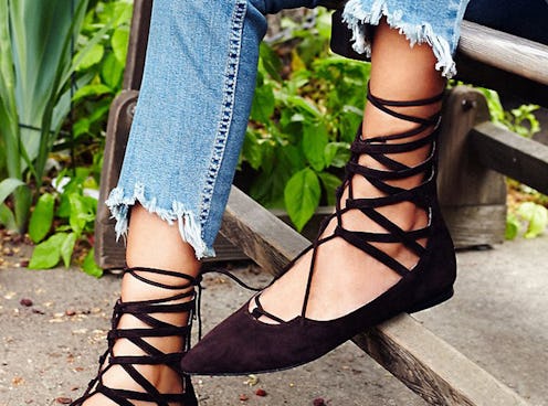 They're also incredibly versatile to style. Black lace-up flats will easily dress up your most ripped up pair of boyfriend jeans but they will also go perfectly with a suede mini skirt this fall. Lace-up heels will look great with a pencil skirt at the office and with a sexy LBD on date night. And once the temperatures start to get a little chilly, lace-up flats will look particularly cute with tights or a chunky pair of gray cable-knit socks.
