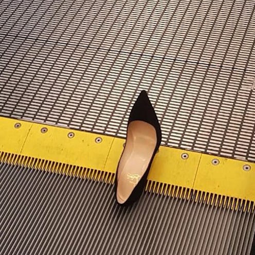 So who's the mystery shoe-owner? Turns out it belongs to shoe designer Nareesha McCaffrey, who posted a photo of the accident on Instagram, with a caption "Great meeting at @TeenVogue...I left you guys a souvenir. RIP my @louboutinworld it just died at the Condé Nast." I feel your pain, Nareesha. But this is probably why I tread extra carefully whenever I ride the escalator in heels.