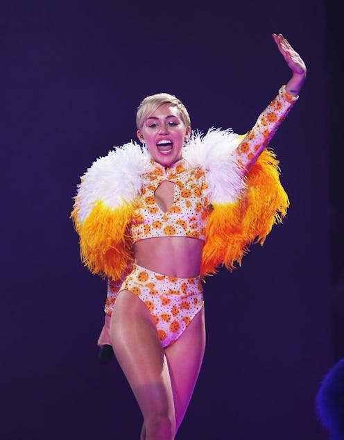 Miley Cyrus isn't shy about standing out. If anything, she prides herself on it. She recently posted an Instagram photo wearing a fruit and vegetable-patterened onesie while preparing for her gig of hosting Sunday's MTV Video Music Awards. With watermelons, avocados, and more, you'd assume the outfit couldn't be outdone... but if you think that, you're sorely mistaken. While wearing the aforementioned ensemble, Cyrus posed for pictures with Baddie Winkle, aka the coolest 87-year-old on social media. Wearing an embroidered flowery sweatshirt that's a good match to Cyrus' EKAT katsuit, the Instagram-famous grandmother proves Cyrus may have met her match. Seriously, it's like a foreshadow of what Miley Cyrus will be like in 60+ years. (And if that's the case, she'll be just as awesome as ever!)