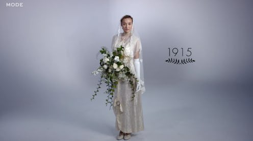 Like most of the Mode videos, 100 Years of Wedding Gowns begins with the earliest date. In this case, a gown from 1915. The frock isn't exactly stylish by today's standards, but does have elements that you can clearly see have been translated into contemporary bridal looks. The lace veil is still standard in most wedding fashion, and the silky fluidity of the gown is reminiscent of current chiffon or tulle a-line silhouettes. While these modern elements may be visible in the antique gown, it's still easy to see that bridal style has come a long way.