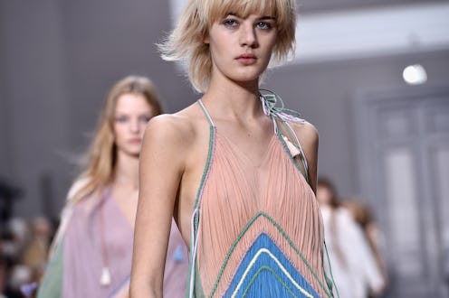 Fall collections are often about dark colors, while spring collections are frequently much more colorful, sometimes to the extreme. Which was the case with Chloe's SS 2016 rainbow runway. Creative director Clare Waight Keller used every color on the wheel, showcasing tie-dye pieces, rainbow hems, and even colorfully striped knits in all different shades of yarn. This is the rainbow collection of your day-glo dreams.