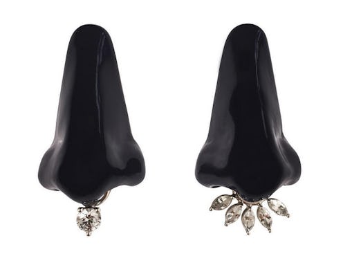 “Maybe we can move away from having to wear an engagement ring — introduce engagement rings, engagement earrings, engagement bracelets, and to add a little punkiness to it, a little irony, I wanted to introduce the engagement nose ring," Delettrez told Vogue. "It’s a fake piercing but with real diamonds."