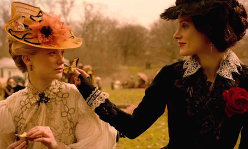 The gothic romance horror film Crimson Peak takes place in the late 1800s early 1900s, and, as such, implemented a delightful amount of Victorian-era feminism. Although I originally went to the movie for Tom Hiddleston, I left feeling thrilled by the gender equality in the Guillermo Del Toro film. That's right, Crimson Peak is definitely a feminist film, and that's what attracted Jessica Chastain (who plays Hiddleston's onscreen sister Lucille) to the story. Chastain told reporters at the New York premiere on Wednesday that, as a feminist, she was so excited to see how strong the Crimson Peak women were were written to be. "It was really important [to me]," she says. "When I read the script that was the first thing I noticed, that there were two amazing female characters. Most of the time I get a script and I'm usually reading the only female character in the movie."