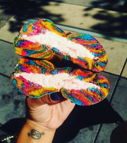 I interrupt your regularly scheduled programming this morning to bring you a truly mouthwatering PSA — Rainbow Bagels are officially a thing, and they are the stuff your Funfetti-filled dreams are made of. Just when you thought the pinnacle of rainbow-laced news was Lucky Charms' marshmallow-only box of magic, news of The Bagel Store's most colorful confection (and its cult following) has gone viral, alerting those of us unfortunate enough to dwell outside of a reasonable driving radius of Brooklyn, NY how mundane our a.m. eating routine truly is. But wait! I'm just getting word that Rainbow Bagels can be shipped anywhere in the United States. Since we obviously will all subsequently be blowing our budgets on this supergalactic breakfast food of the soul, let's take a closer look, shall we?