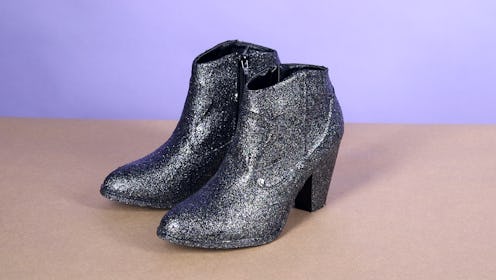 You start by taping off the parts of the shoe that you don't want glitter on — likely the sole of the shoe and the zipper part, but you do you. Next, blend together a few colors of glitter and combine with some Mod Podge to make a colorful paste. The color possibilities are endless, but you'll want to add at least a few for the full galaxy effect.