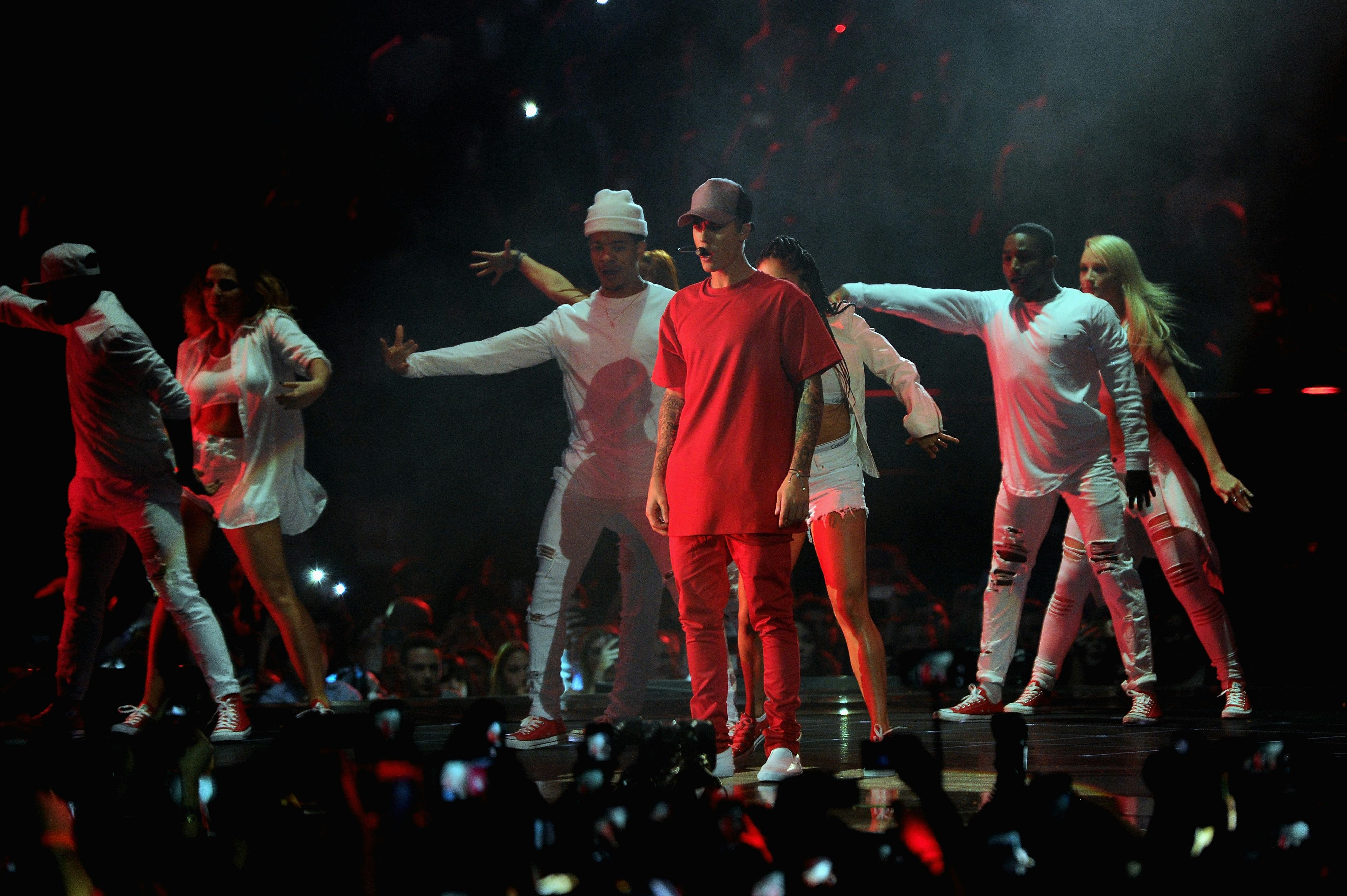 Bieber wore a red shirt and red pants during his performance among dancers dressed all in white, so he certainly stood out on stage. The performance began with the Biebs dancing in a box made of light dots and kinda looked like the movie Tron. The light dots soon morphed into lines and then more colors. Soon, his backup dancers joined him as he strutted and danced on the stage through a tunnel of lights. The performance ended with — what else — fireworks. The audience, which was full of Bieber fans, went wild.