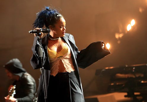 Guess who made her triumphant return to the stage (her most natural habitat) this past weekend? Rihanna channeled Madonna in a recent outfit for a show, rocking her supremely sexy version of the menswear trend during her surprise performance at the Los Angeles concert. The fashion rebel wore a baggy striped suit with a long jacket, loose-fitting, boyfriend-like trousers, a cami, and a yellow bra top. It was a modern update of Madonna's '90s-era, vintage "Vogue" look.