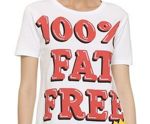 To me, luxury brand Moschino has always seemed to focus on fun concepts and bold prints — rather than co-opting serious social issues. Unfortunately, Moschino's food shaming T-shirts now available on Shopbop don't really align with that perception. As reported by Cosmopolitan on Oct. 27, Moschino has released a set of three equally problematic cotton gym shirts. The brand has not yet responded to Bustle's request for comment.