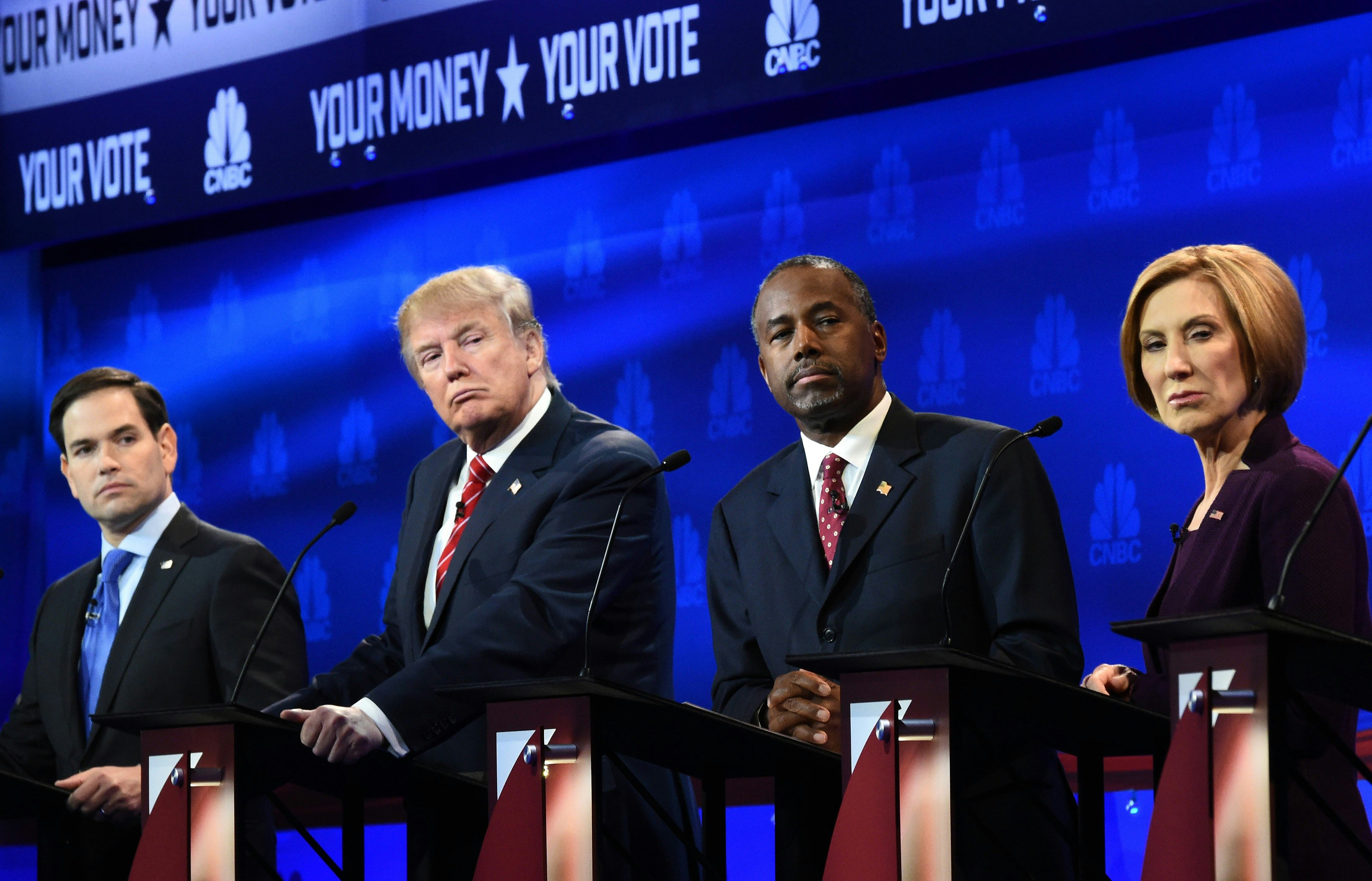 Here we go again: Fox Business Network and the Wall Street Journal are hosting the fourth GOP presidential debate on Tuesday, and it's sure to be... just like the last debate. Well, not exactly. The network has narrowed down the candidate field, allowing just eight candidates to take the stage at the primetime debate. New Jersey Gov. Chris Christie and former Arkansas Gov. Mike Huckabee have been relegated to the JV forum, along with Rick Santorum and Louisiana Gov. Bobby Jindal, scheduled prior to Tuesday night's main event. Of course, GOP front-runners Donald Trump and Ben Carson will be headlining the primetime debate, where they'll be joined by these usual suspects: Sen. Marco Rubio, Carly Fiorina, Jeb Bush, Sen. Ted Cruz, Ohio Gov. John Kasich, and Sen. Rand Paul.