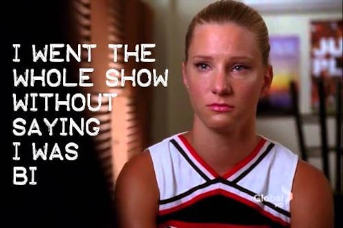 What do Buffy the Vampire Slayer's Willow, The L Word's Alice, and the title character of Constantine all have in common? If you're familiar with the concept of bi erasure, you know exactly where this is going: All three characters have clearly dated both men and women, but as author and activist Nicole Kristal's memes about bisexual TV characters hilariously point out, not a single one has used the word "bisexual" on screen. "I went the whole show without saying I was bi," reads one screengrab of Glee's Brittany, whose relationship with her fellow cheerleader Santana came to eclipse her sexuality — despite the fact that she dated men throughout the series as well.