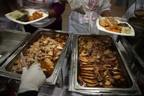 Another way to get involved this holiday season is to create a centerpiece for your Thanksgiving table that's made of fresh food, and then donate its contents to your local food pantry afterwards. Gary Oppenheimer, founder and executive director of AmpleHarvest.org, tells Bustle that the centerpieces are an easy way to incorporate more giving into your holiday festivities. AmpleHarvest.org works to bring fresh food to local food pantries, which mostly offer canned or dried food. Creating a centerpiece of beautiful produce and delivering it to a food pantry the day after Thanksgiving (or any holiday!) is an easy way to help the hungry share some fresh food.