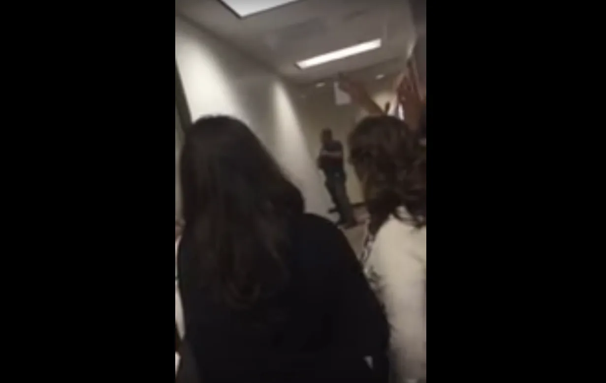 In the video, a group of employees huddle in a hallway while an officer asks a colleague ahead of him whether the scene is secure. "If you're not cool, I'm not walking them," he shouts. People are visibly on edge. Getting the OK, the officer then beckons for staffers to walk past him through the building's hallways. The officer asks the employees, most of whom are silent or speak in hushed voices, to keep their hands above their heads where he can see them. As the employees pass, some say "thank you," while the officer reassures them, "I'll take a bullet before you do, that's for damn sure."