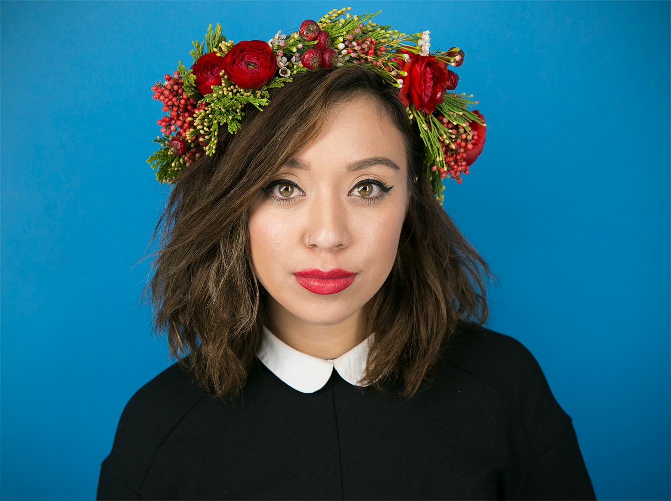 The first tip? "Your hair should be down," Doramus insists. It makes sense, since you're probably going for a sort of hippie-angel-forest princess vibe if you're rocking a flower crown — and hippie-angel-forest princesses never wear ponytails. For the actual placement, Doramus thinks the ideal spot to rest your crow is about an inch to and inch and a half back from your hairline. "Some people put it closer down on the forehead, but I prefer it back," she says, adding that "If you have bangs, let them show!" she says. The point of all this is to make sure you're still the focus of the whole look. If the crown rests directly across your forehead, it becomes more of a distraction than a pretty accessory to your already-fierce self.