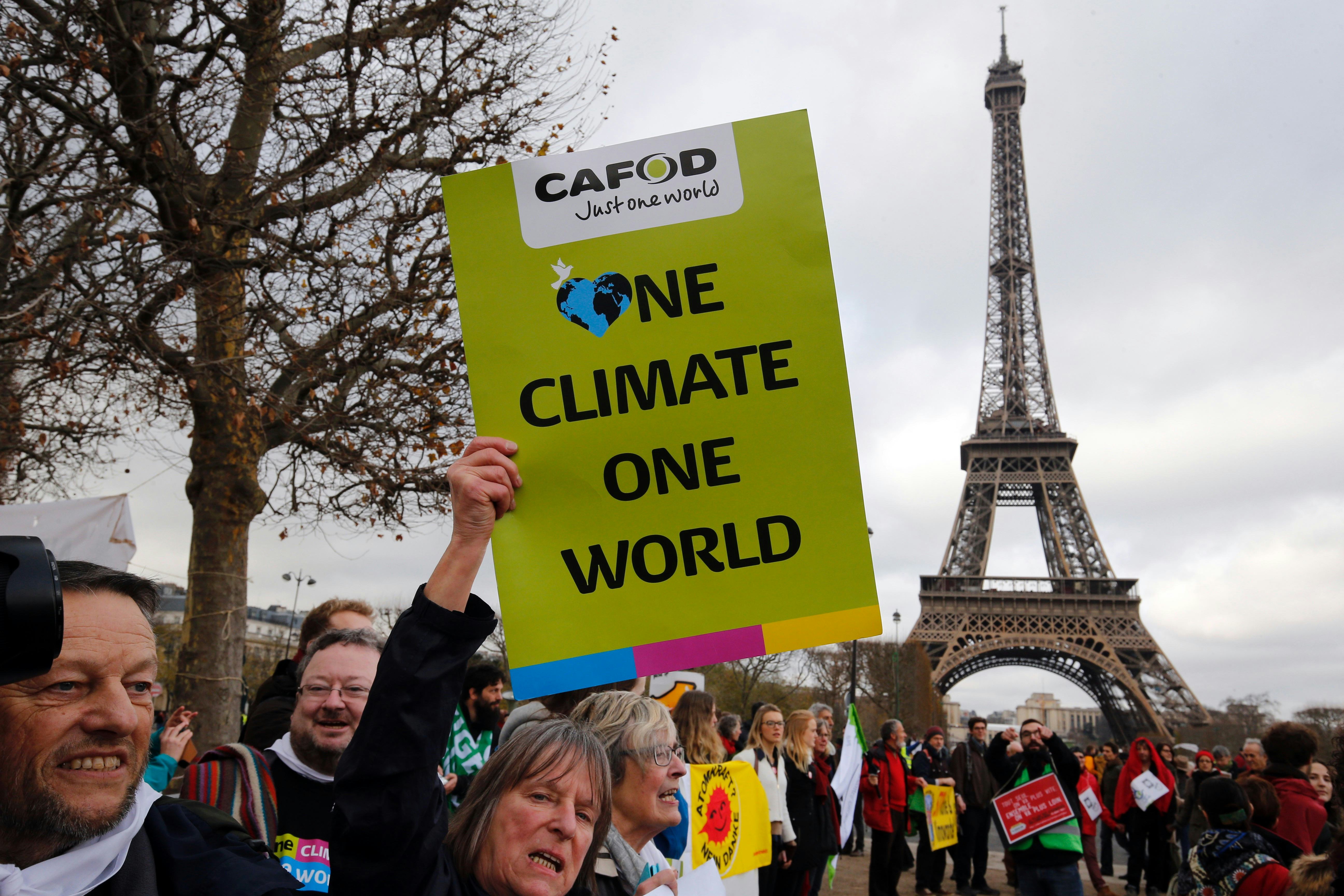 The mood near the Eiffel Tower seems ebullient. Images of the tower have also circulated with various points of the deal such as "1.5 Degrees," and "For The Planet" near the bottom of the lit up landmark.