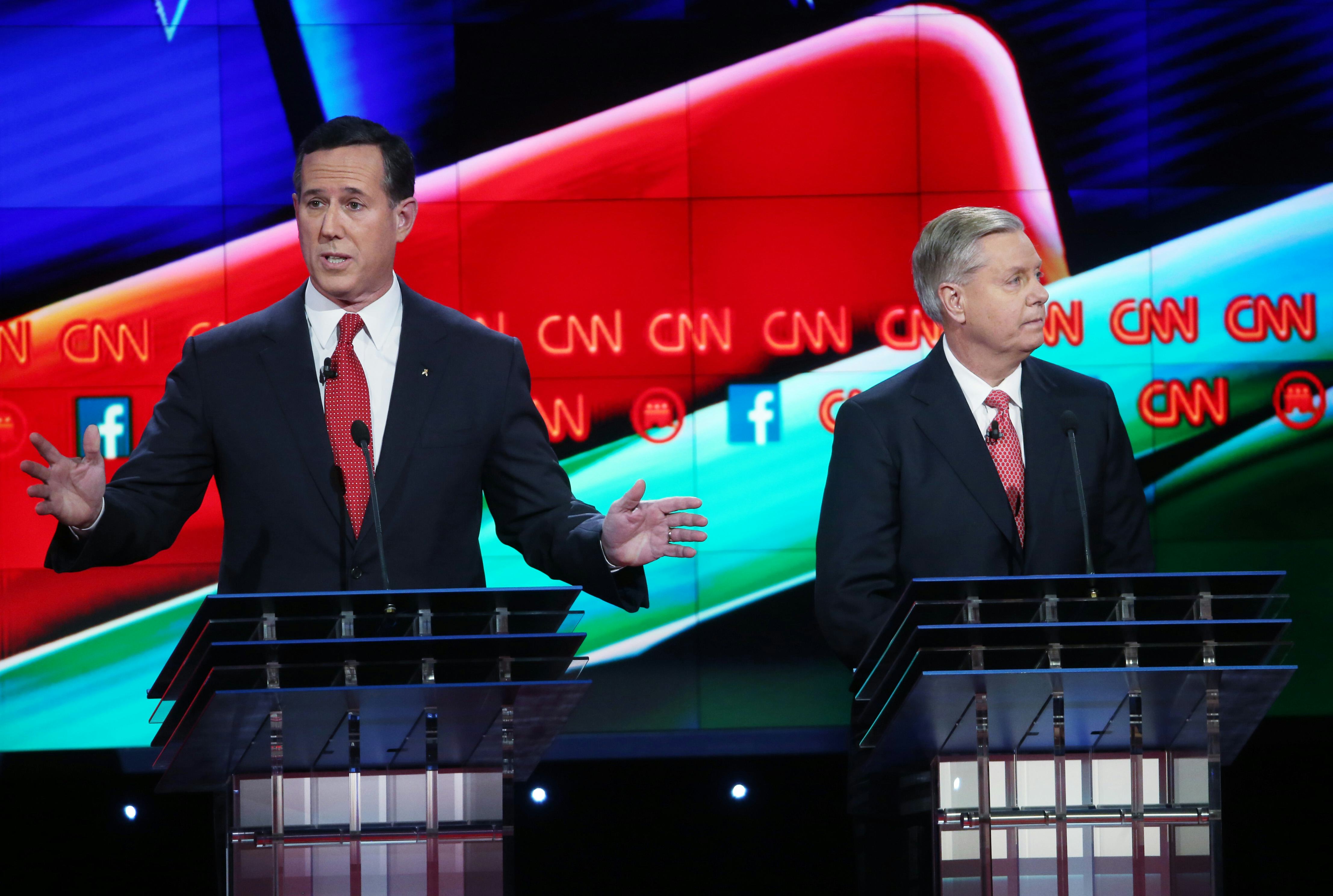 During the so-called "kiddie table" Republican debate on Tuesday night, moderator Wolf Blitzer asked candidates about their strategies to defeat ISIS. When the question was directed at Rick Santorum, the camera, fortunately, kept focused on both Santorum and Sen. Lindsey Graham, who has made it a point to position himself as an expert on all things national security and defense. The camera caught Graham's exasperated face as Santorum talked about Islam — and it was the perfect expression for any conversation that Santorum is involved in.