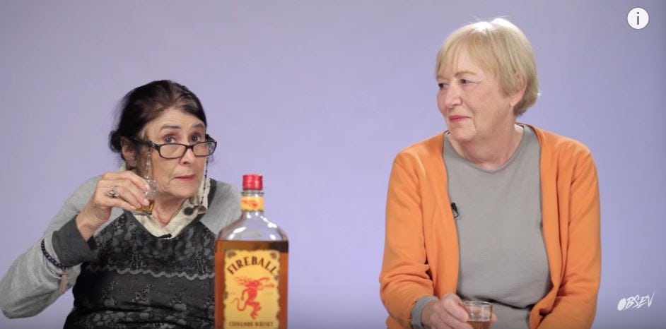 Fireball whisky has become a favorite hard liquor of Millennials, with that cinnamon flavor and burning aftertaste always making you come back for another round. Little old ladies, however, are probably not a demographic group you'd expect to see interested in the drink — but believe you me, watching grannies try Fireball for the first time is an experience definitely worth having. Happily, the YouTube channel Obsev (aka Obsessed With Everything) is here to grant us all the privilege of seeing what the senior crowd thinks of the stuff. Can you think of a better combination?